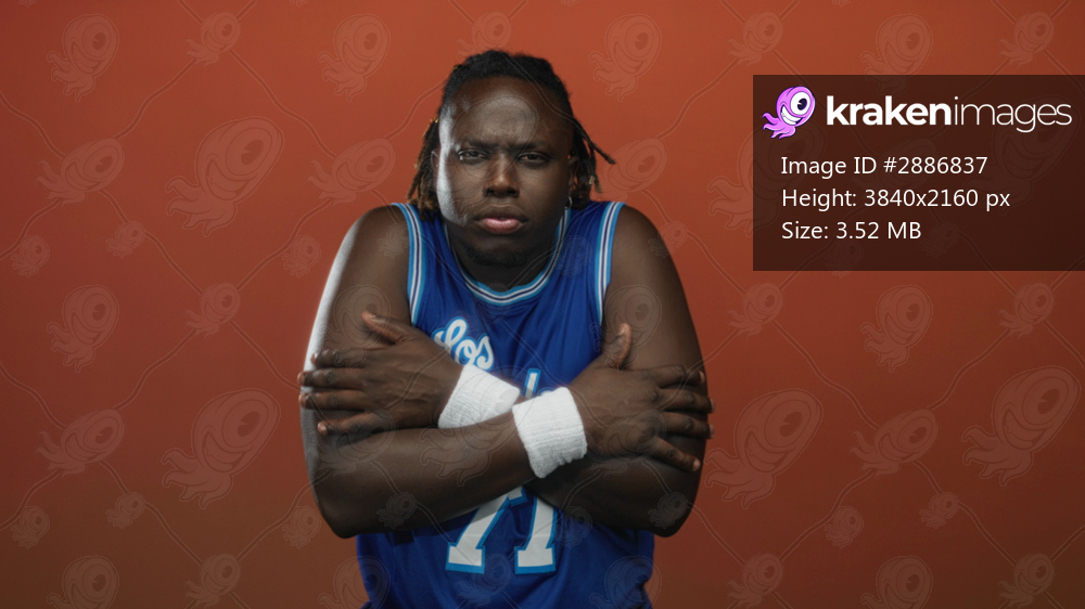 Man with crossed arms showing bare arms in studio against orange backdrop, wearing blue basketball jersey and white wristbands; vulnerability.