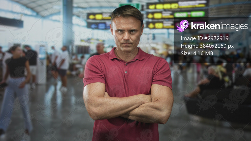 Man with crossed arms showing forearms at airport terminal, surrounded by passengers and flight signage; impatience waiting travel.