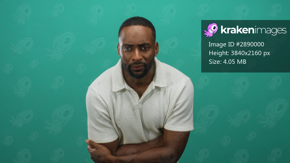 Man with crossed arms showing forearms and white polo shirt in teal studio three quarter closeup pose leaning slightly forward and facing camera; concern introspection. - Kraken Images