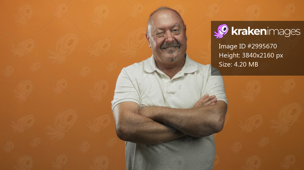 Man with crossed arms and slight smile wearing white polo shirt in studio with orange backdrop; confidence resilience.