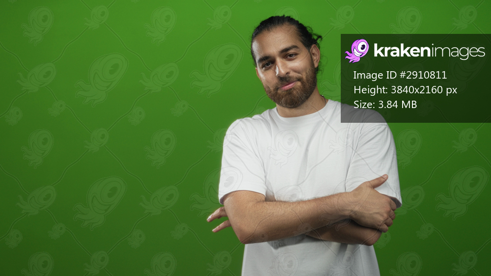 Man with crossed arms and visible forearms wearing a white t shirt in a green studio; calm confidence approachable.