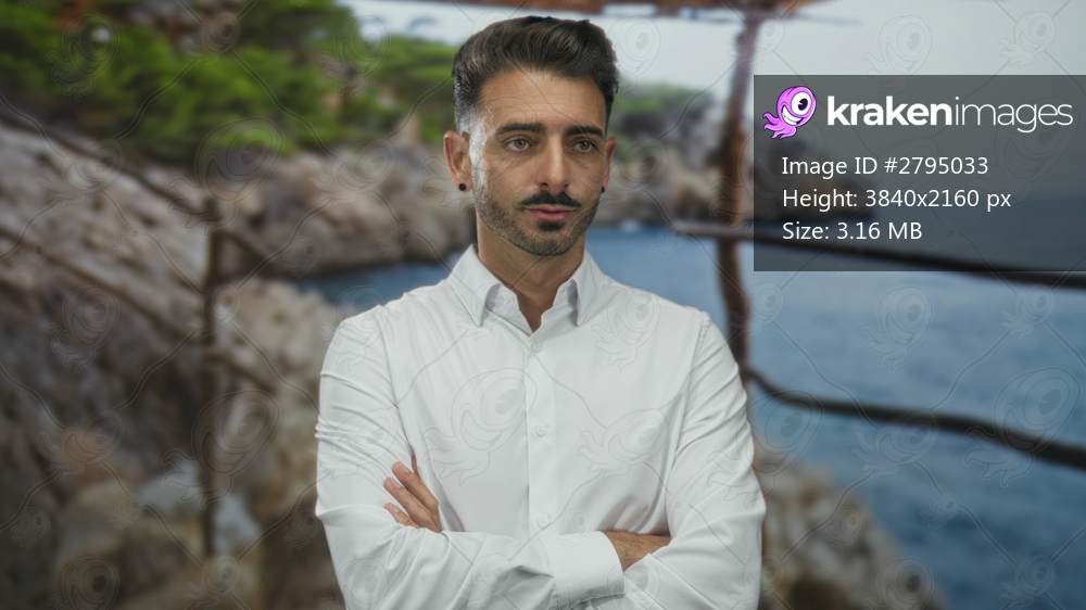 Man with crossed arms wearing white shirt against green forest and rocky coast under blue sky; rejection.