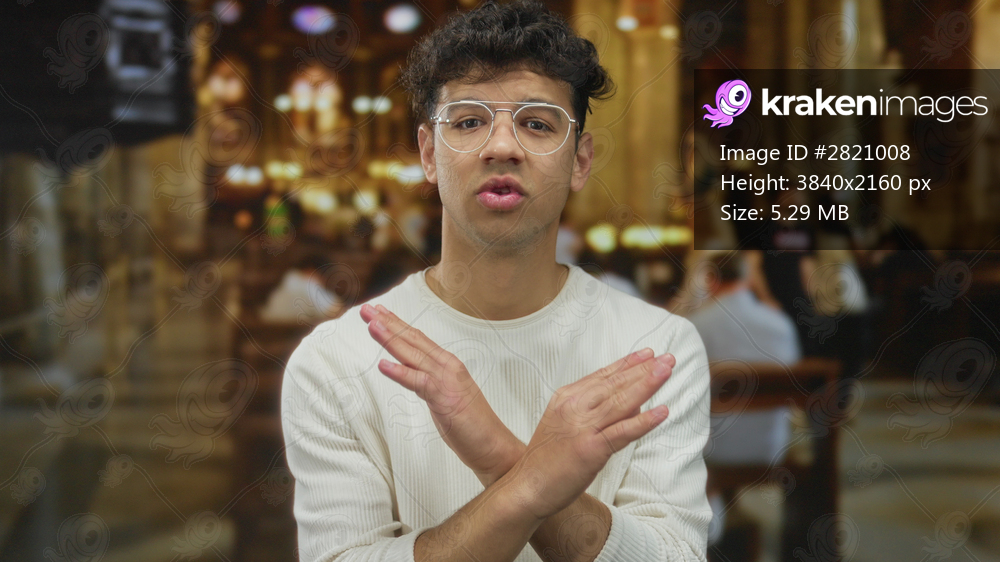 Man with crossed arms wearing white sweater stands inside church building under stained glass windows showing denial; rejection.