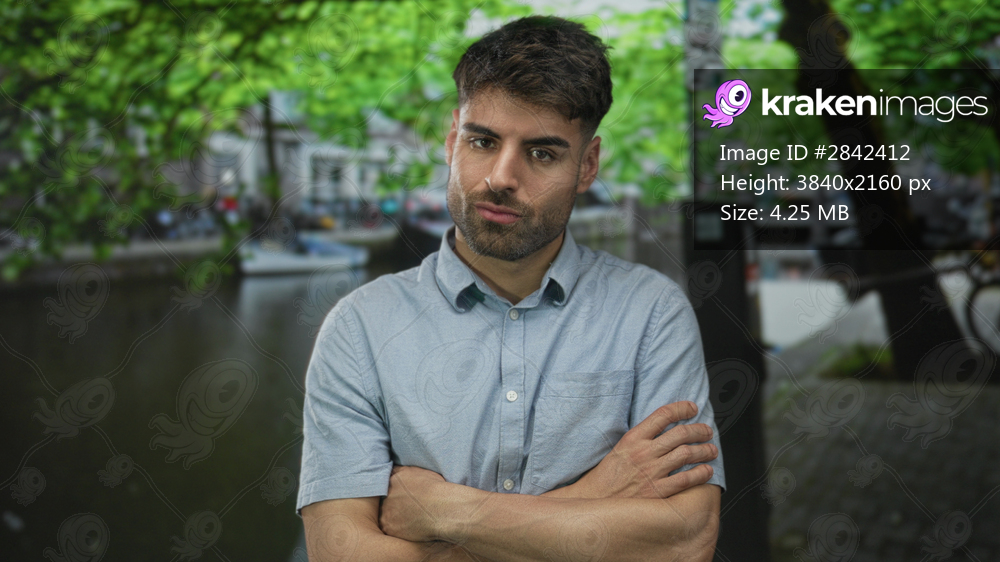 Man crosses arms by a canal in an urban street setting with vibrant green trees behind him; defiance.