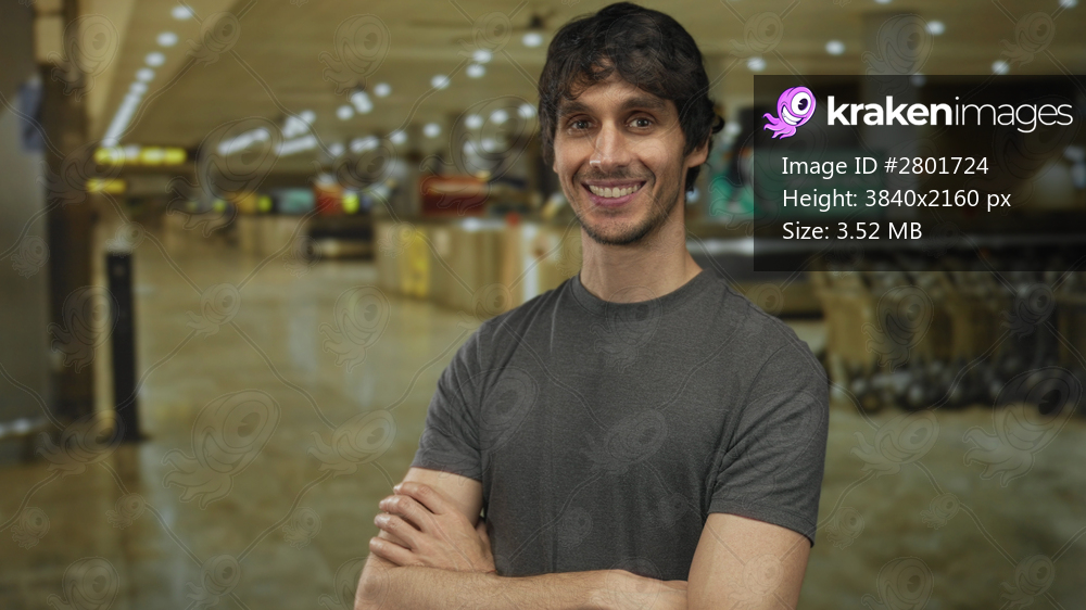 Man crosses arms and turns head with slight smile at airport terminal; quiet confidence.
