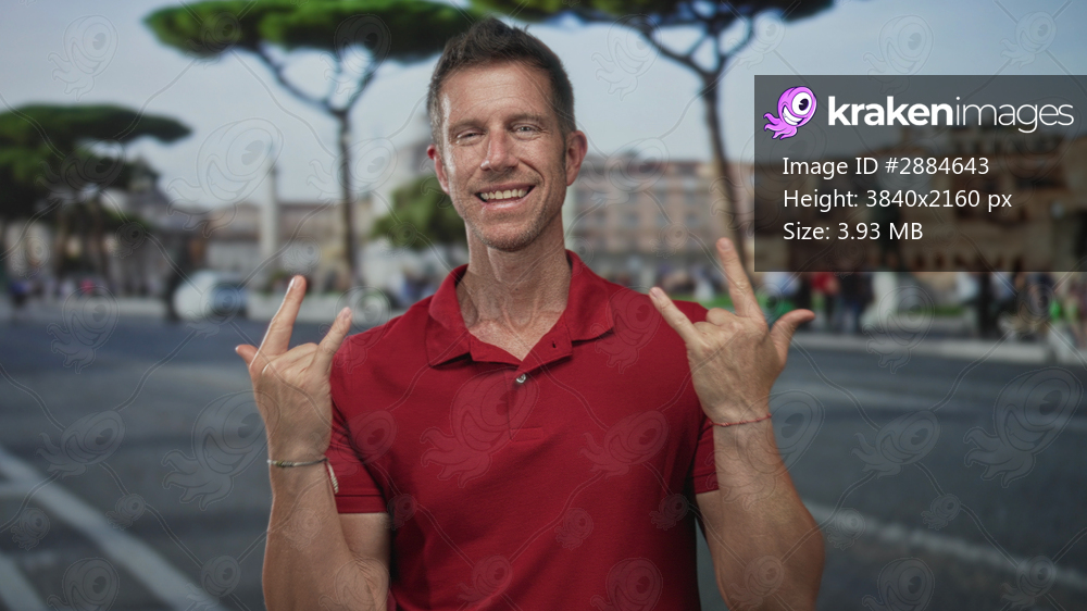 Man crossing arms and pointing fingers in street with hands visible and fingers spread; playful confidence.