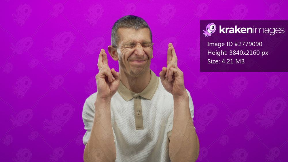 Man crossing fingers in hopeful gesture against vibrant pink wall with isolated expression, caucasian male conveying optimism and anticipation.
