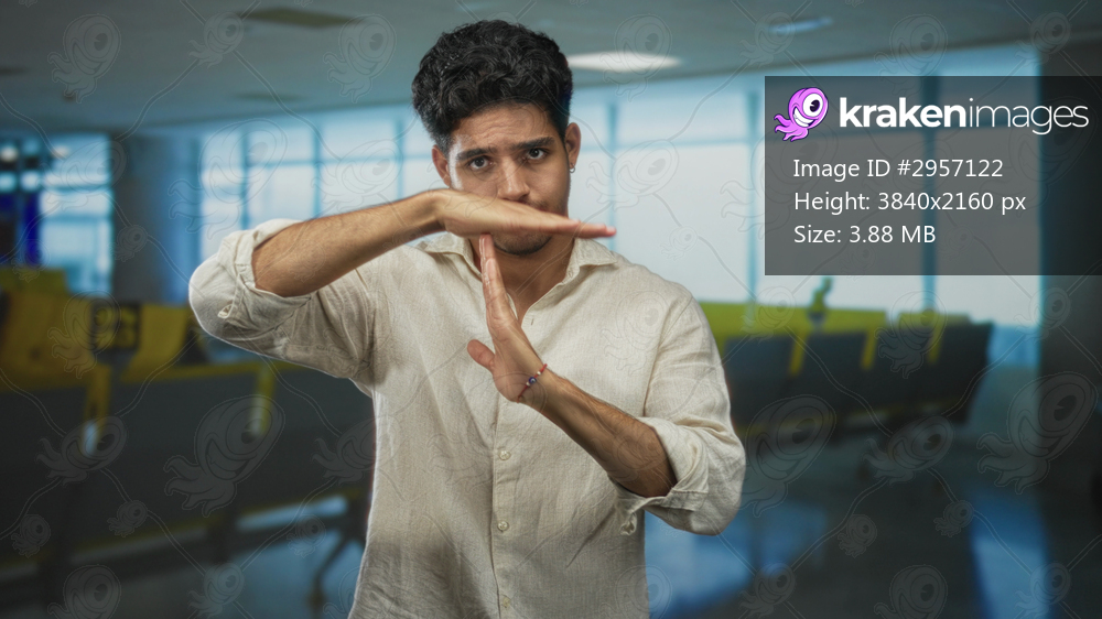 Man crossing hands in front, palms visible, gesturing stop in airport terminal; rejection boundary caution.