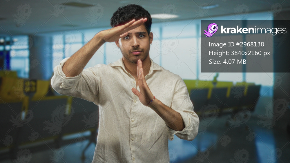 Man crossing hands in front, palms visible, gesturing stop in airport terminal; rejection boundary caution.