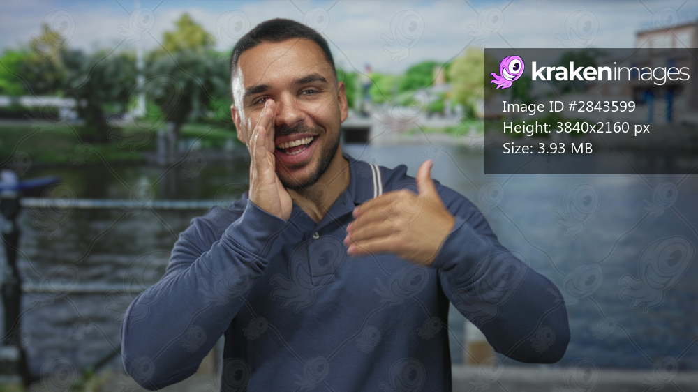 Man with cupped hand to mouth calling out on street by canal waterfront buildings, signaling come here; invitation greeting welcome beckon.