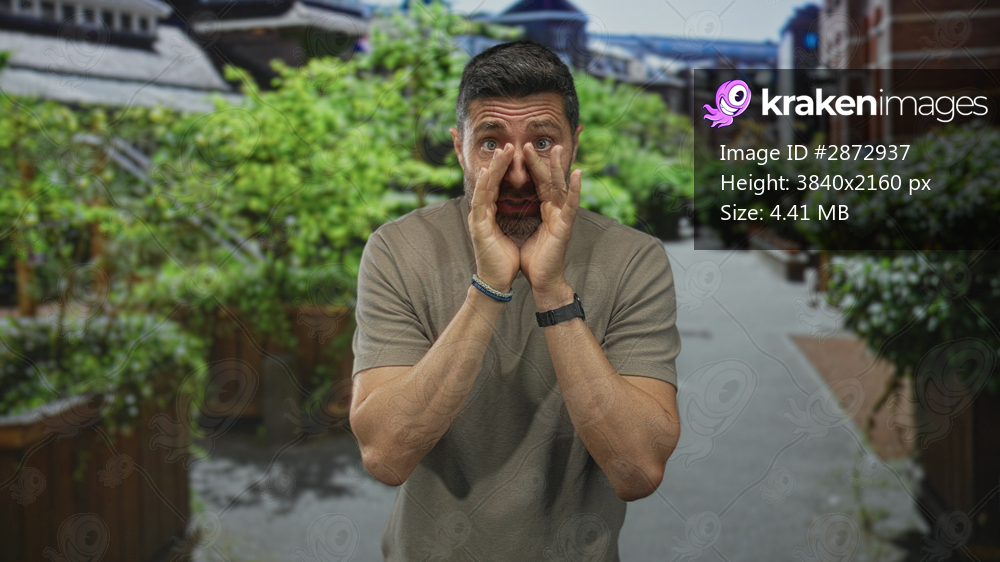 Man with cupped hands around mouth calling loudly toward camera on street lined with planter boxes and buildings; urgent alarm.
