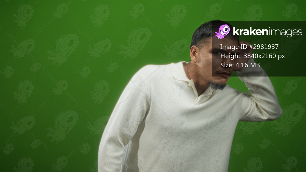 Man cupping ear with hand in studio green screen wearing white sweater, leaning forward in a listening pose and later smiling; curiosity engagement.