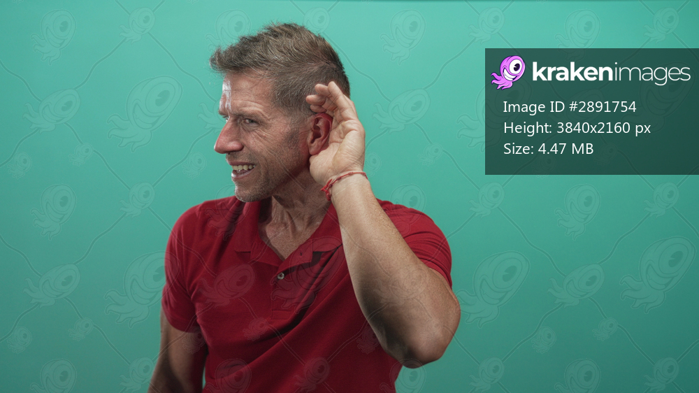 Man cupping ear with hand listening in teal studio wearing red shirt and polo collar; curiosity focus.