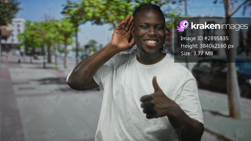 Man cupping ear with hand on a city street sidewalk, glancing toward traffic and parked cars while listening intently; curiosity.