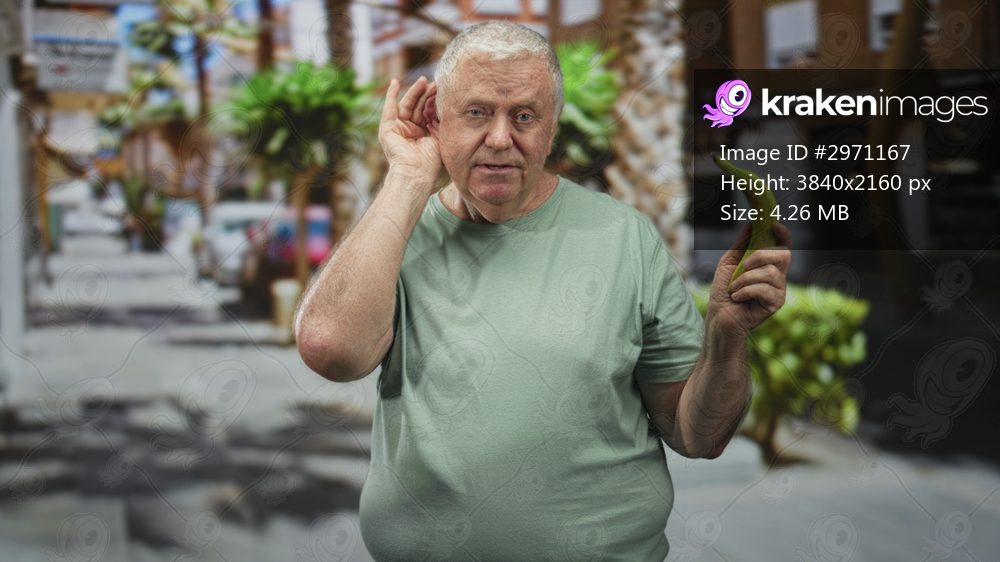 Man cupping ear while holding banana with right hand on a sunny street lined with palm trees and shops; absurdity confusion.