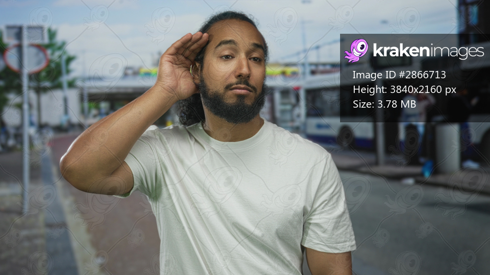Man cupping hand to ear at street bus stop near a waiting bus and sidewalk, wearing white tee; curiosity focus.