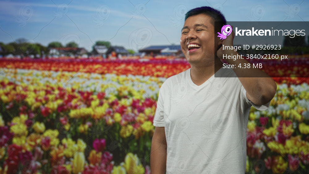 Man cupping hand to ear beside a tulip field, smiling and leaning slightly forward in studio, facing right and enjoying the blossoms; joy and play.