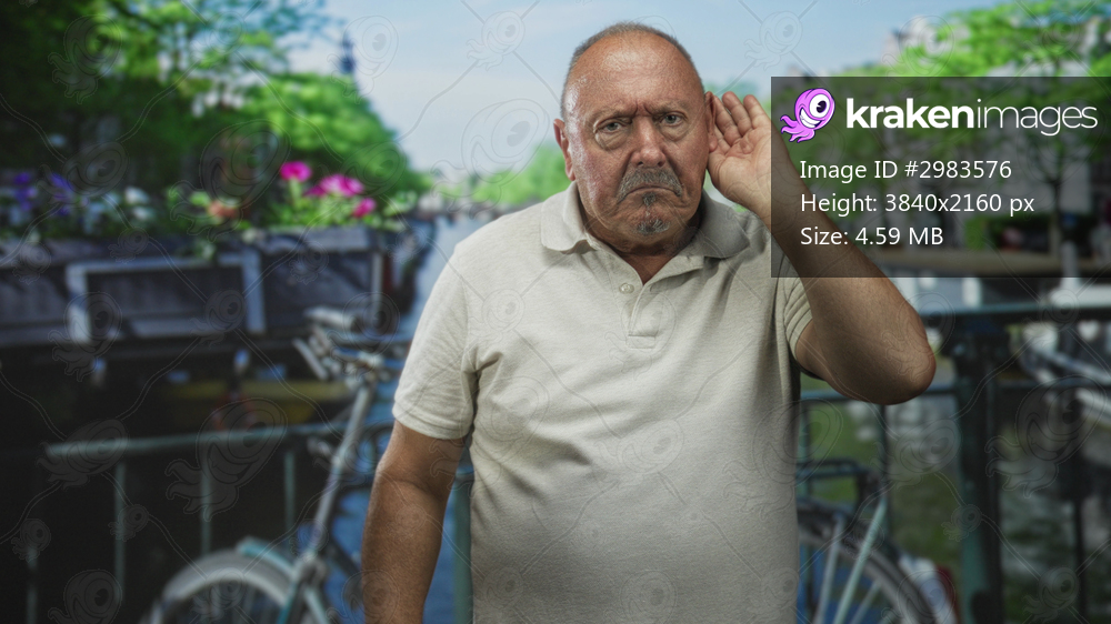 Man cupping hand to ear beside bicycle on a canal bridge on a street, listening with puzzled expression; confusion.