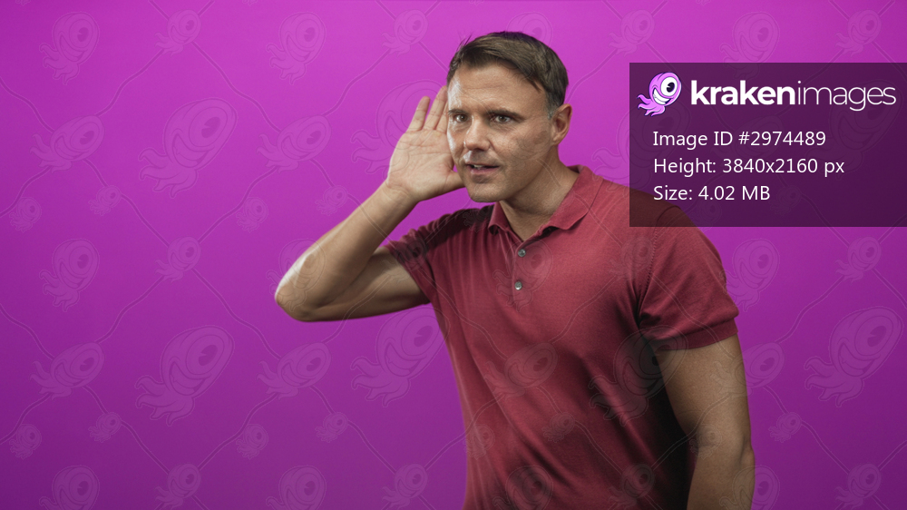 Man cupping hand to ear in studio wearing polo shirt in front of magenta backdrop in a listening gesture; curiosity engagement.