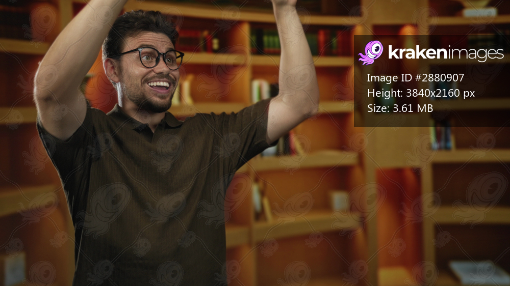 Man cupping hand to mouth calling out toward bookshelves in a warm library interior while smiling and gesturing upward; excitement learning.