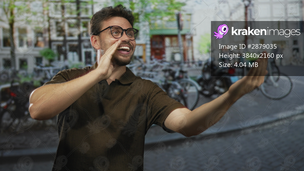 Man cupping hand to mouth calling and placing other hand on chest on amsterdam street; friendly greeting joy.