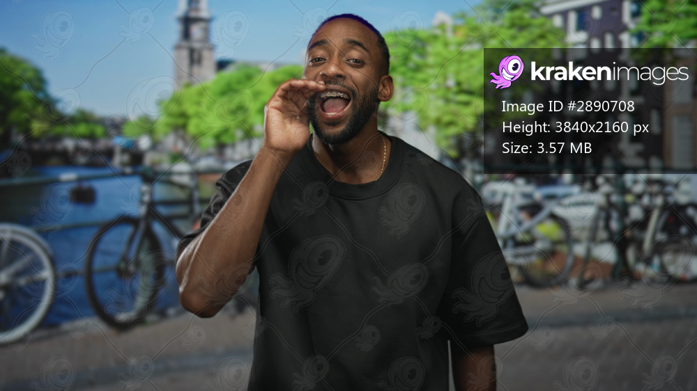 Man cupping hand to mouth and clasping hands while smiling on a canal street in amsterdam with bicycles by the water; joy camaraderie.