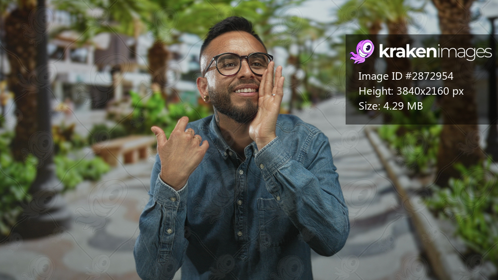 Man cupping hand to mouth on a palm lined street walkway, wearing denim shirt and glasses, smiling and pointing with other hand; communication joy.