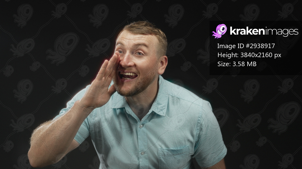 Man cupping hand to mouth while shouting and gesturing forward in black studio with light blue shirt and visible open mouth; excitement.