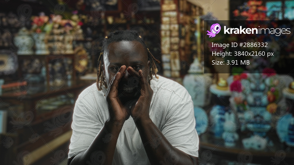 Man cupping hands around mouth in a shop filled with ceramic vases and flowers, wearing white shirt, smiling; announcement joy.