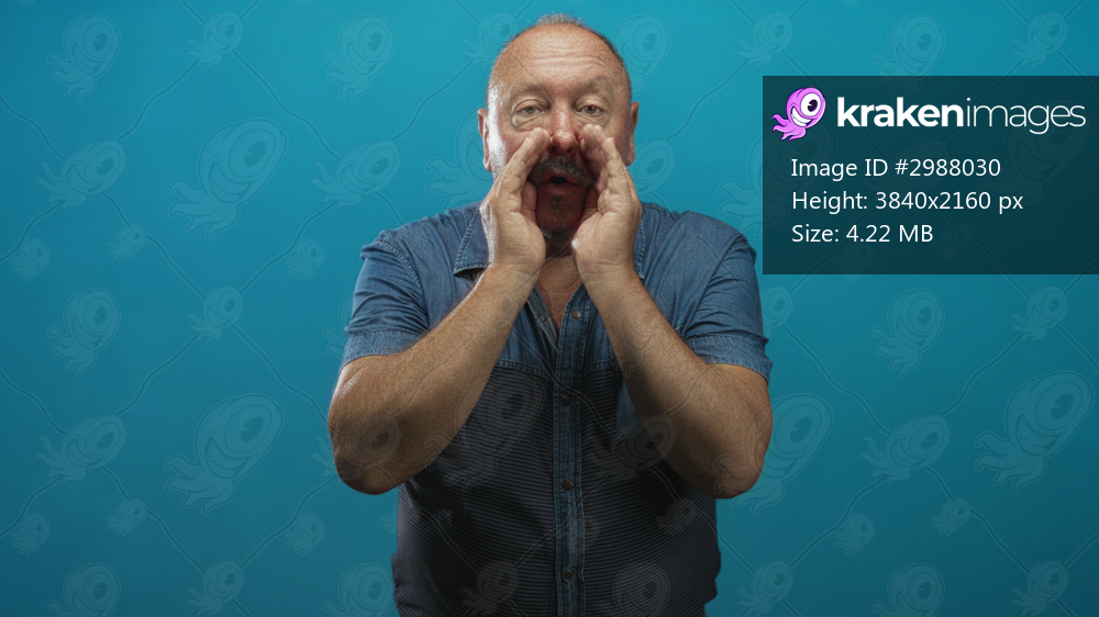 Man cupping hands around mouth shouting toward camera in studio, senior hispanic male in blue short sleeve shirt with mustache and goatee; urgency.