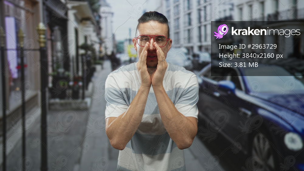 Man cupping hands over mouth on city street beside parked car, wearing red glasses and striped shirt while calling out to passersby; urgent plea.