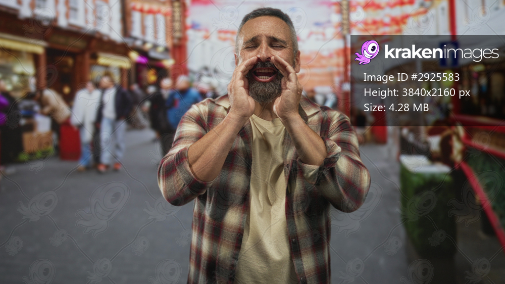 Man cupping hands shouting on a crowded street with plaid shirt and beard visible, mouth open and lively expression; joy community.