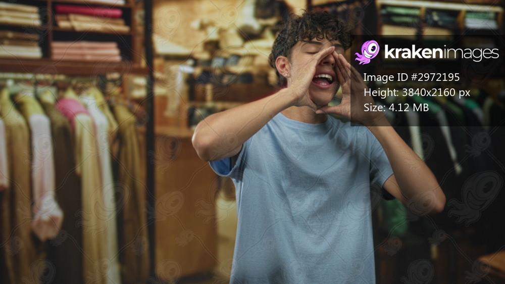 Man cupping hands to mouth, calling across clothing racks in a retail clothing store while pointing and covering his mouth in different gestures; urgency. - Kraken Images