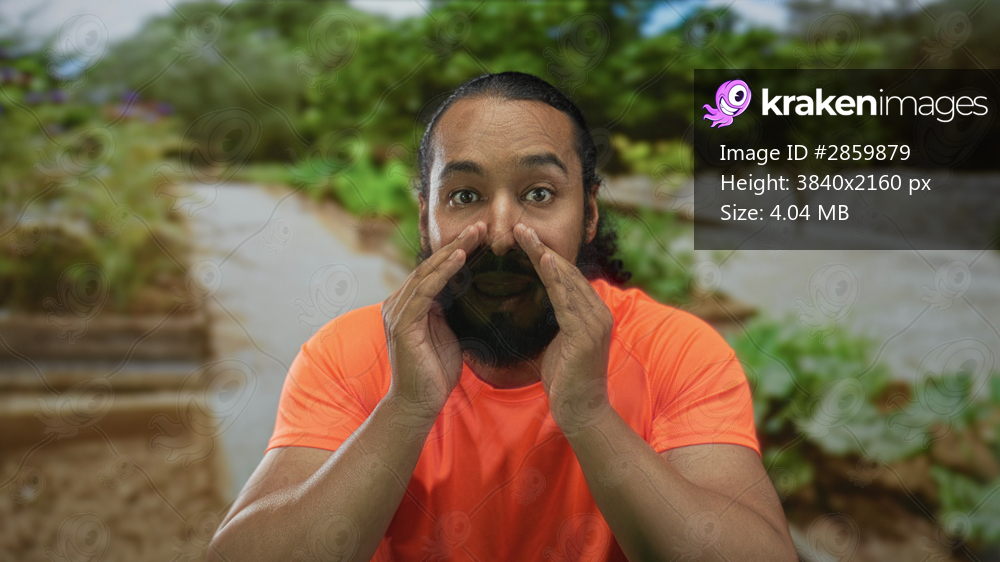 Man cupping hands to mouth calling on a forest path wearing orange shirt with green park foliage behind; alertness warning.