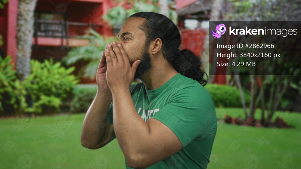 Man cupping hands to mouth in park volunteer shirt near red building, calling out to group; community outreach urgency.