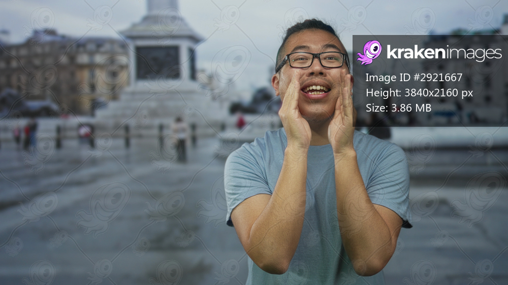 Man cupping hands to mouth shouting on a busy city street by a stone monument and fountain; celebration cheer joy.