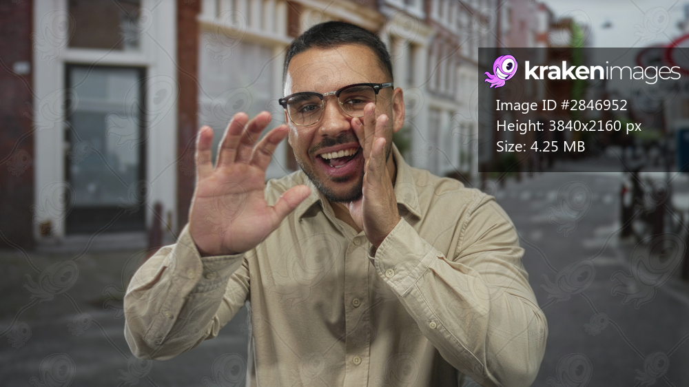 Man cupping hands to mouth wearing glasses and beige shirt on busy city street in daylight; urgent announcement.