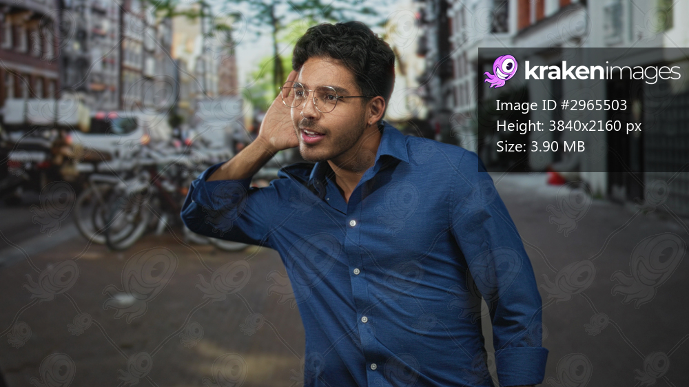 Man cups hand to ear by parked bicycles on a busy urban street sidewalk, wearing a blue shirt and round glasses while leaning in to listen; curiosity and engagement. - Kraken Images