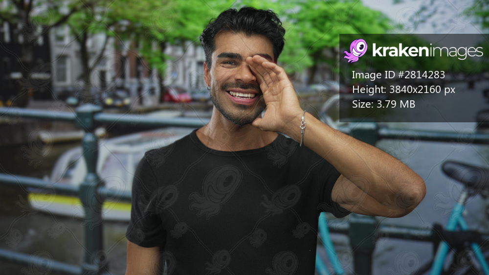 Man cups hands around mouth by a canal on a street lined with bicycles and trees; excitement and communication.
