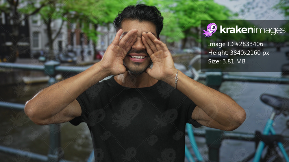 Man cups hands around mouth by a canal on a street lined with bicycles and trees; excitement and communication.