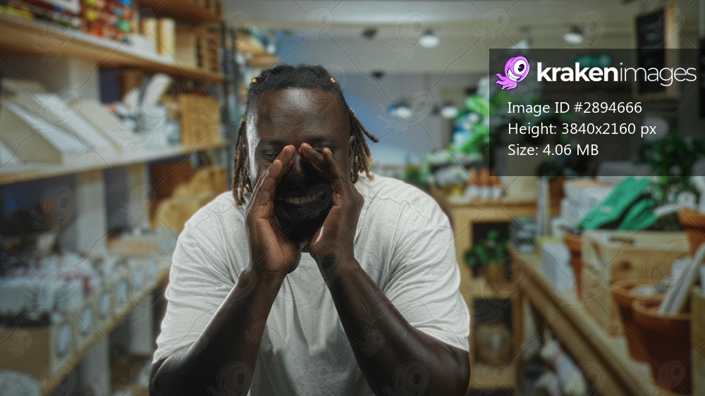 Man cups hands to mouth calling out inside a building shop aisle filled with home decor shelves and pottery; joyful call.