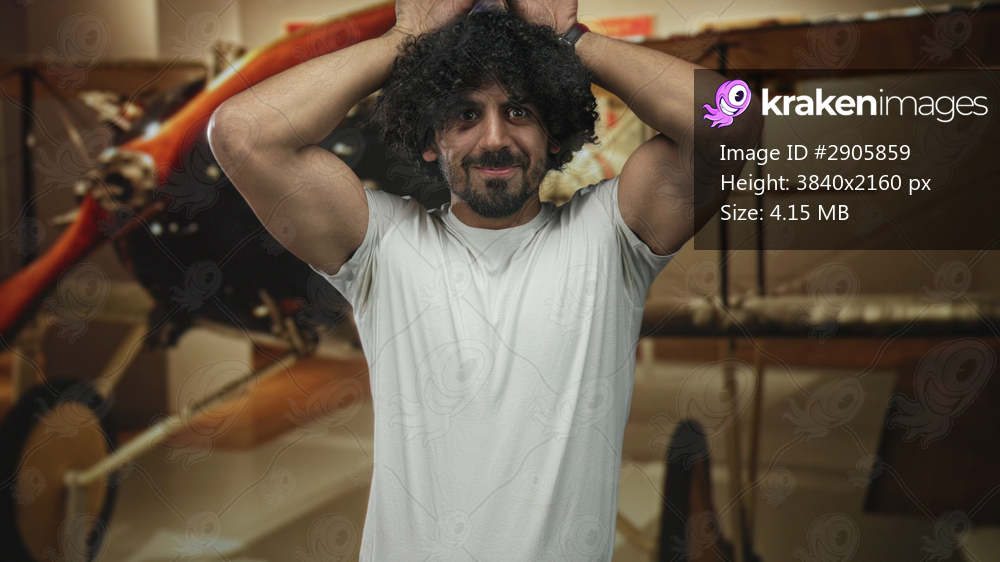 Man with curly hair and beard, hands on head beside vintage biplane in museum exhibit, wearing white tshirt and showing biceps; nostalgia amusement.