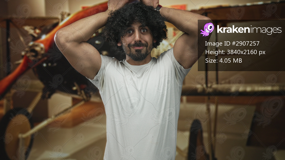 Man with curly hair and beard, hands on head beside vintage biplane in museum exhibit, wearing white tshirt and showing biceps; nostalgia amusement.