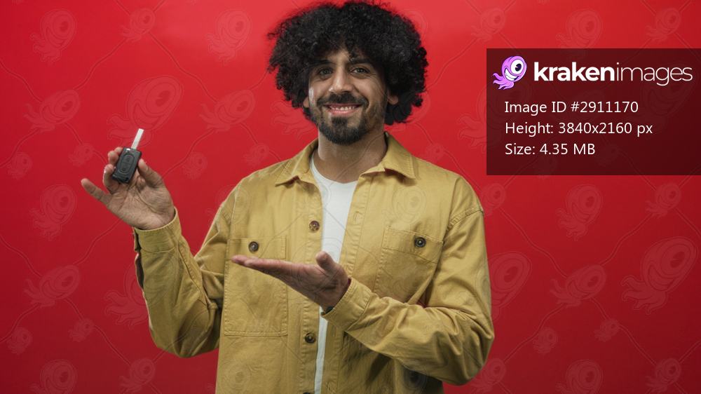 Man with curly hair and beard holding a car key fob in his right hand, palm up, smiling and presenting in red studio; confidence.