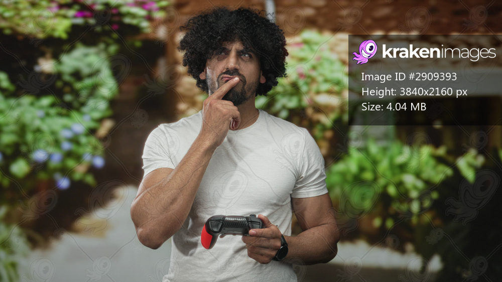 Man with curly hair and beard holding game controller, hand on chin in street among green plants and stone wall; thinking curiosity contemplation.
