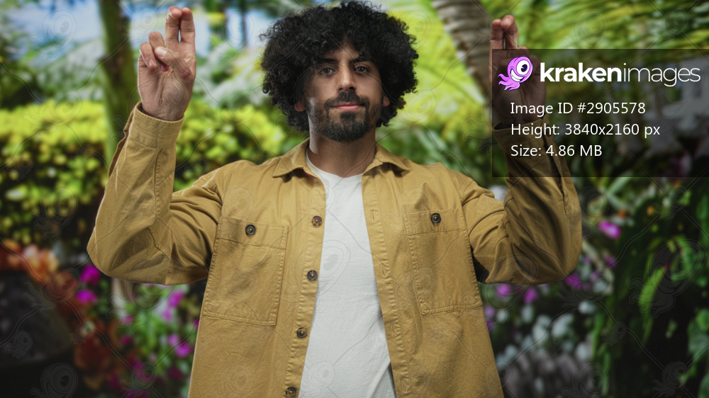 Man with curly hair and beard holds crossed fingers with both hands in park outdoors among green foliage and flowers; hopeful.
