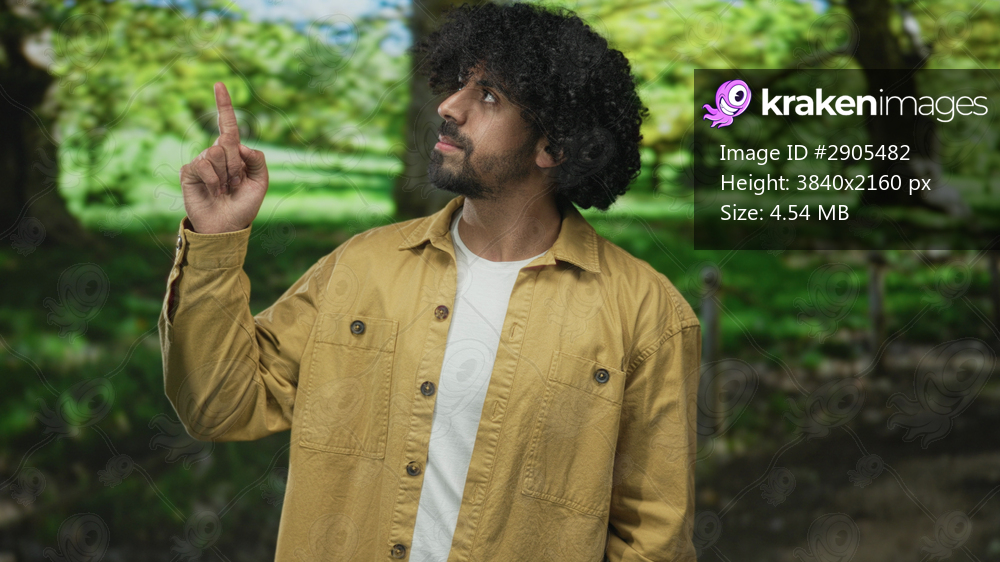 Man with curly hair and beard points finger upward in green park among trees and sunlight, wearing yellow jacket and white tshirt; curiosity.
