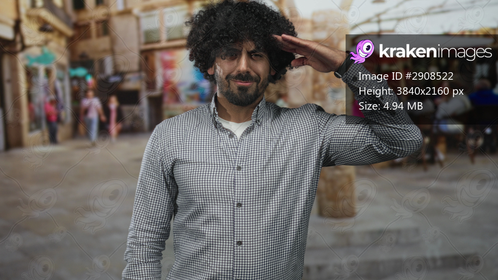 Man with curly hair and beard salutes with hand to forehead in street market; casual greeting friendliness.
