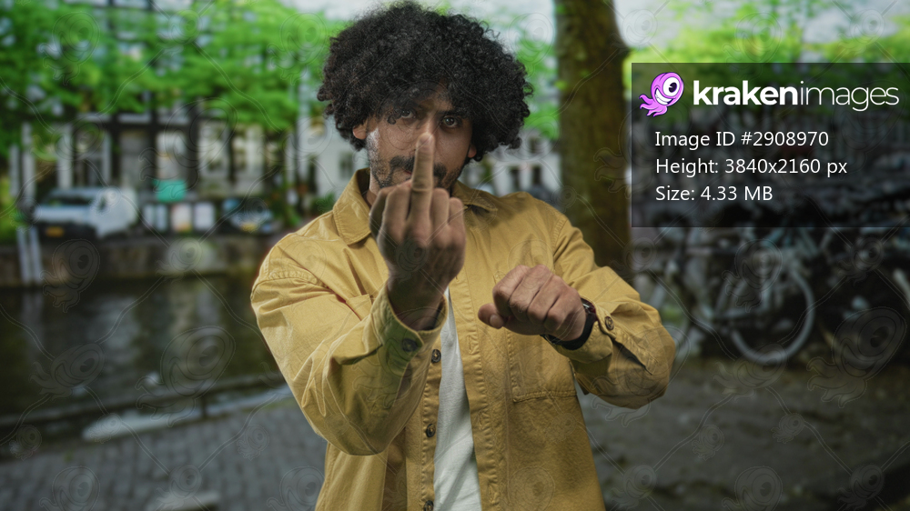 Man with curly hair and beard shows middle finger to camera on street by canal with parked bicycles in amsterdam wearing yellow jacket and white tee; defiance. - Kraken Images