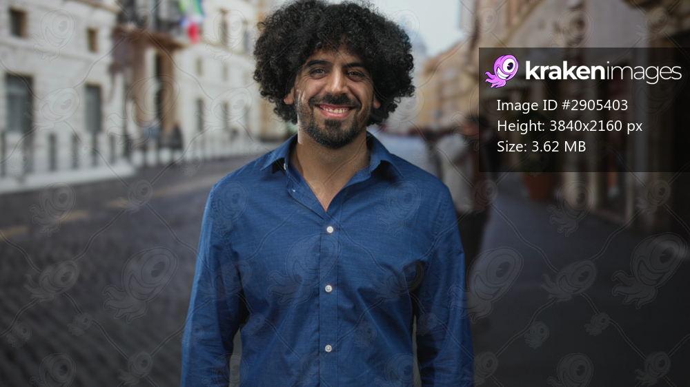 Man with curly hair and beard smiling, face visible, wearing a blue shirt on a cobbled city street with blurred pedestrians and storefronts in view; happiness. - Kraken Images